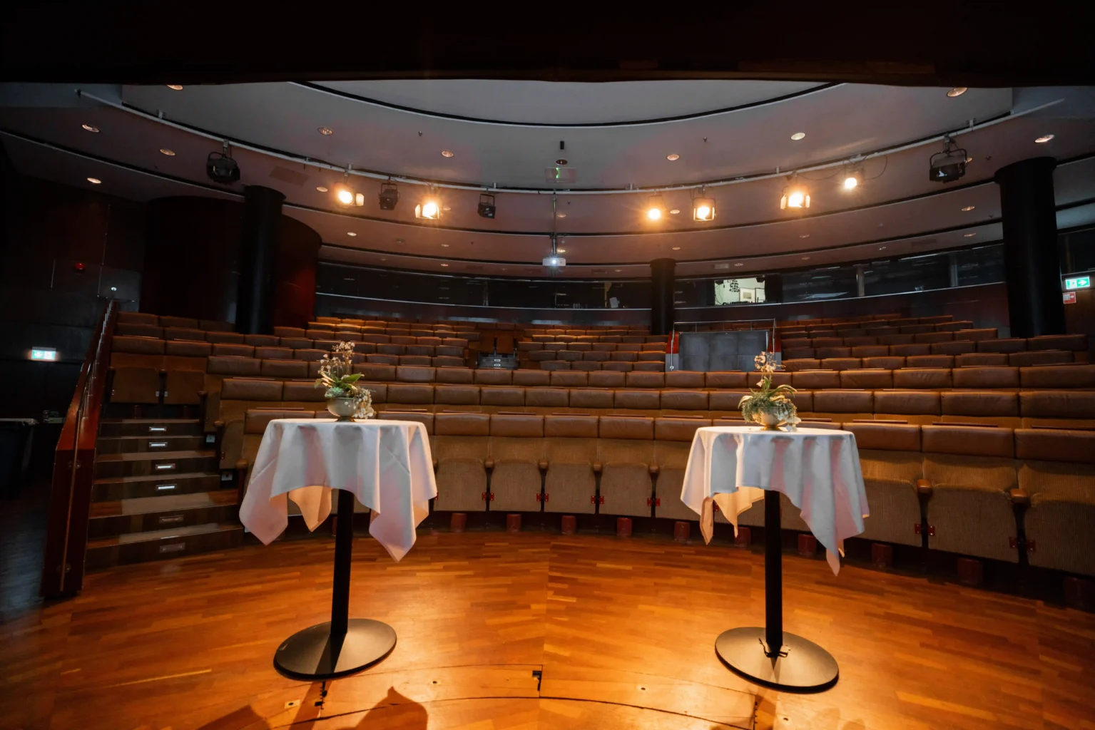 Kammarsalens halvmåneform drar naturligtvis publikens uppmärksamhet till scenen, vilket gör den idealisk för arrangemang som presentationer, seminarier eller bolagsstämmor. Den bekväma interiören och närheten till scenen skapar en välkomnande och diskussionsvänlig atmosfär för små som stora sällskap samtidigt som den intilliggande Studion är perfekt för mingel, fika eller utställningar.